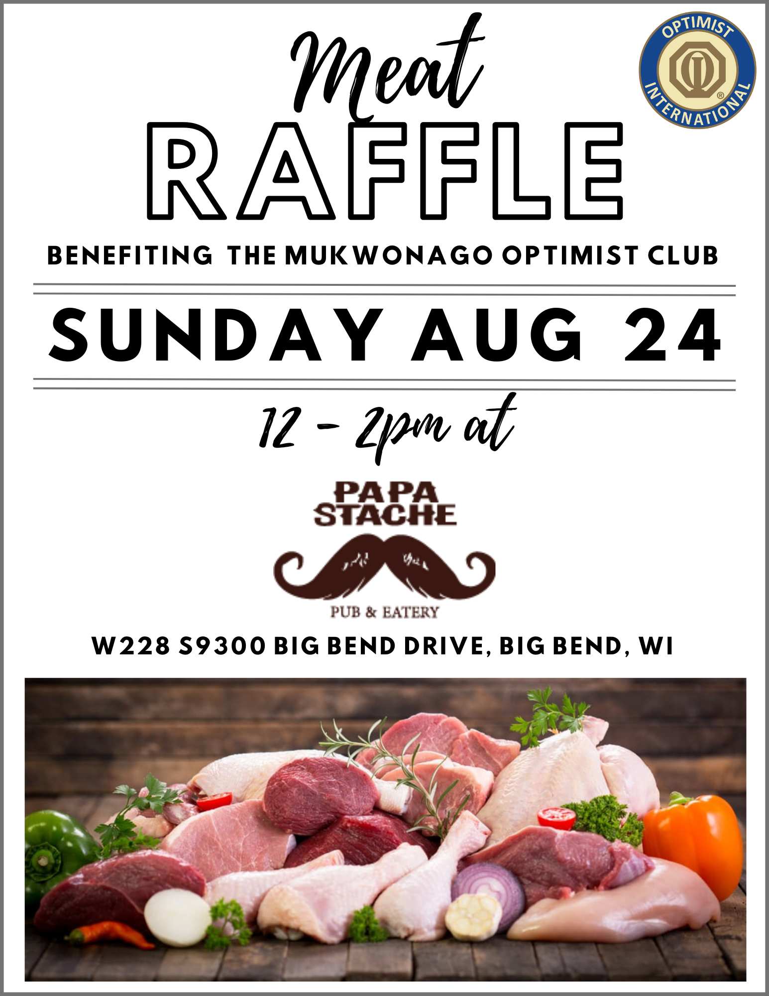 On August 18, 2024 from 12 to 2pm, we are hosting our meat raffle fundraiser at the awesome Papa Stache in Big Bend! We will be raffling off several amazing meat packages, packaged by Roberts Speciality Meat. Proceeds from the raffle will benefit the children’s programs run by the Mukwonago Optimist Club - so come join us, bring friends, and help support out youth!
